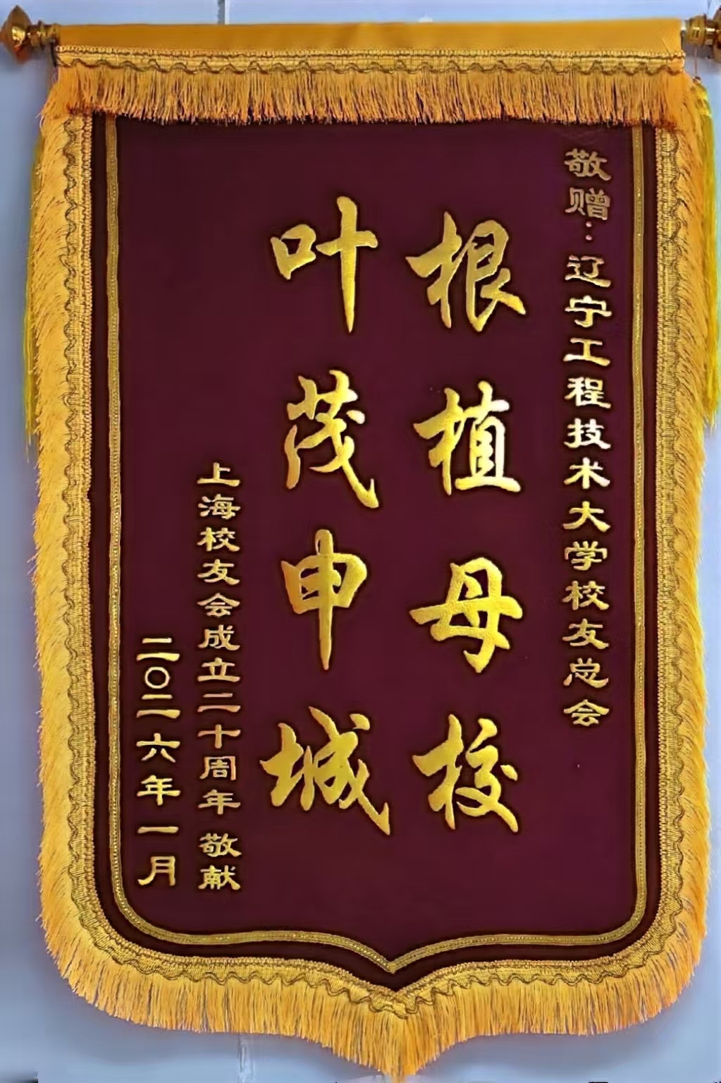 初冬的暖阳洒满校园,一面来自黄浦江畔的锦旗,为这个季节增添了一抹格外温暖的色彩。近日,上海校友会跨越千里,将一面镌刻着"根植母校,叶茂申诚"的鎏金锦旗郑重交至校友总会。这面锦旗既承载着千余名在沪校友的赤子之心,又串联起无数跨越时空的青春记忆,更是校友们对校友总会工作的肯定、认可。这让我们深感责任重大、使命光荣。校友总会今后将以此为动力,持续提升工作水平,更好地服务校友、凝聚力量、为校友与母校搭建起更为宽广的合作平台和更加高效的交流桥梁,促进校友母校同向同行,共同发展。